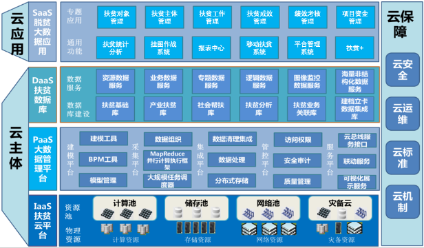 SaaS层,即脱贫大数据应用开发系统。顺利获得建设扶贫对象管理、扶贫主体管理、扶贫工作管理、扶贫成效管理、绩效考核管理、项目资金管理、扶贫统计分析、挂图作战、报表中心、移动扶贫、平台管理、’扶贫+’等系统,支撑扶贫开发工作协同、高效、便捷运行。