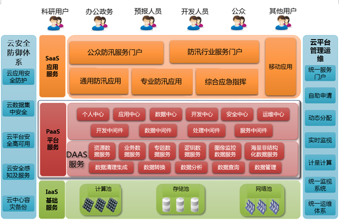 防汛抗旱云平台采用“大平台+微应用”的设计思路,实现一库一图一平台的总体目标。实现大流量、高并发、高响应、高实时需求所带来的计算、存储、扩容、负载均衡、高安全、高可用等问题。“微应用”将当前先进的系统架构理念和大数据平台相结合,在防汛抗旱微应用中心、用户中心等框架下,突破传统大而全的业务开发模式、大胆创新在满足各种防汛抗旱应用功能对接的同时,还可快速搭建各类核心小系统,开发出个性化的微应用,满足防汛及时反应、快速决策和移动防汛的新诉求。