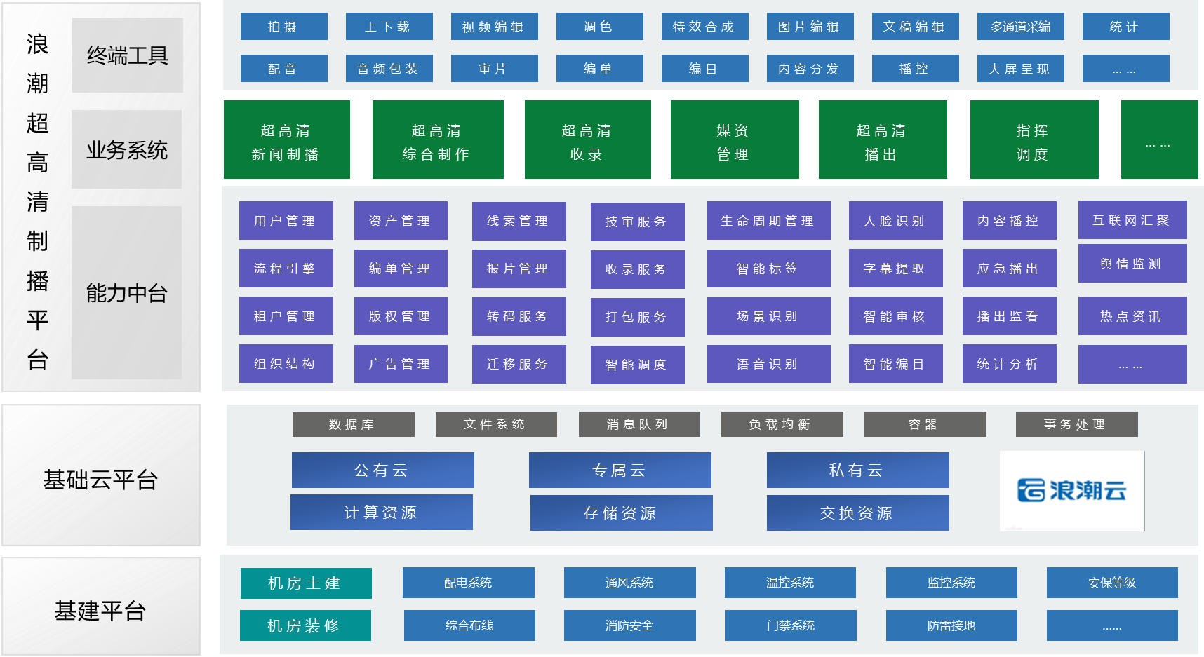 3. 超高清制播方案采用IP化+云平台+AI智能服务的架构,在统一能力中台之上,根据客户实际业务需求可以定制业务系统;