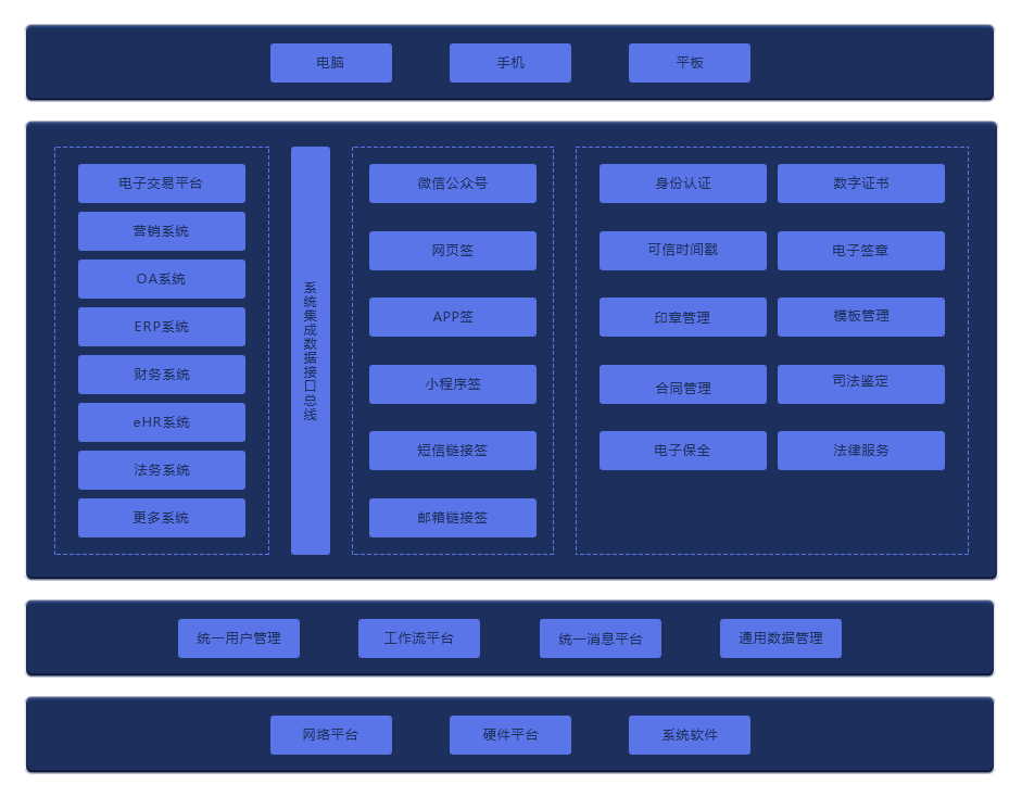 在签署层给予PC、APP、小程序签署,在接入层给予API/SDK接入方式,在应用层给予身份认证、合同签署、合同管理、司法支持四大应用模块