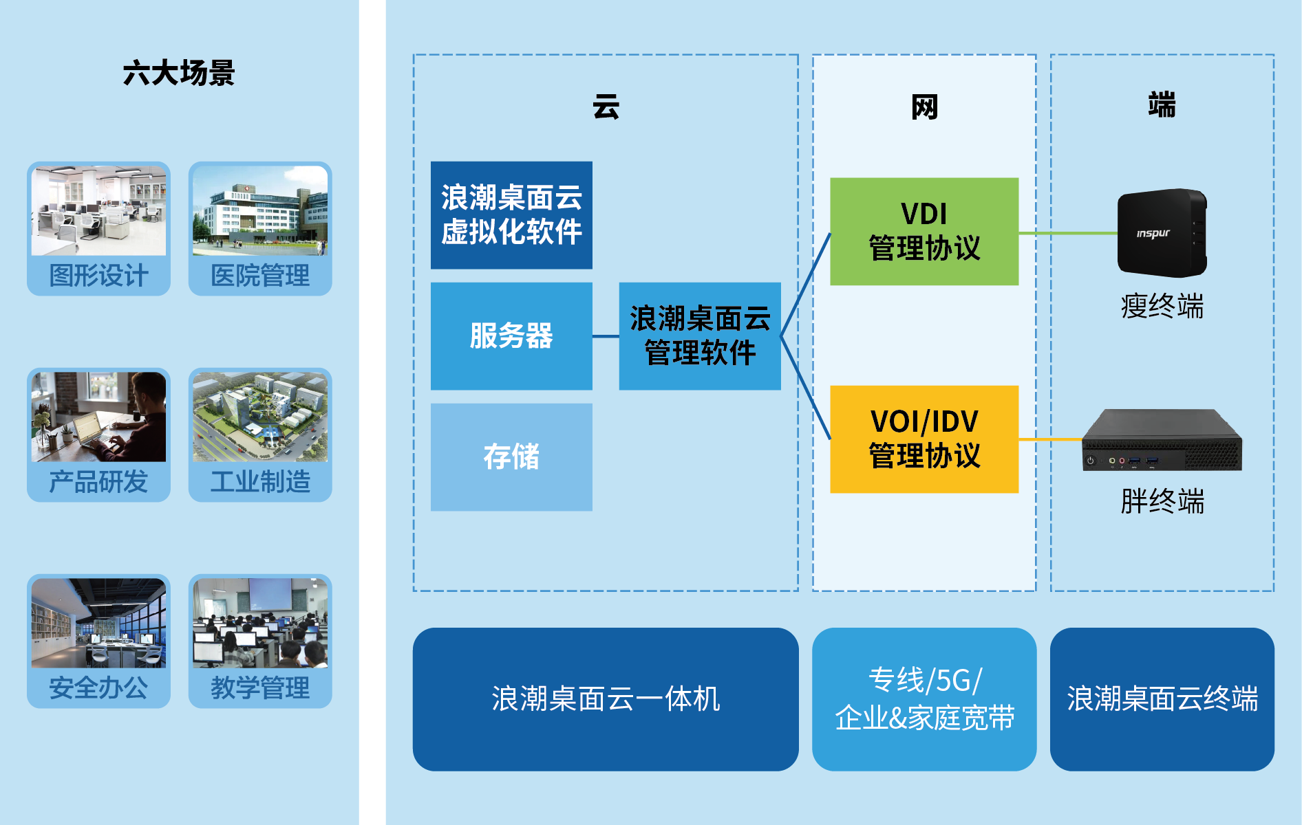 桌面云全系列产品包括:桌面云终端、桌面云软件、桌面云一体机等。桌面云基于虚拟化技术,具备VDI、VOI、IDV架构能力,将计算、存储、网络及终端融合管理、统一运维,帮助客户提升工作效率、简化运维、降低IT综合投入成本,全面支持图形设计、产品研发、安全办公、医院管理、工业制造、教学管理等多个场景。